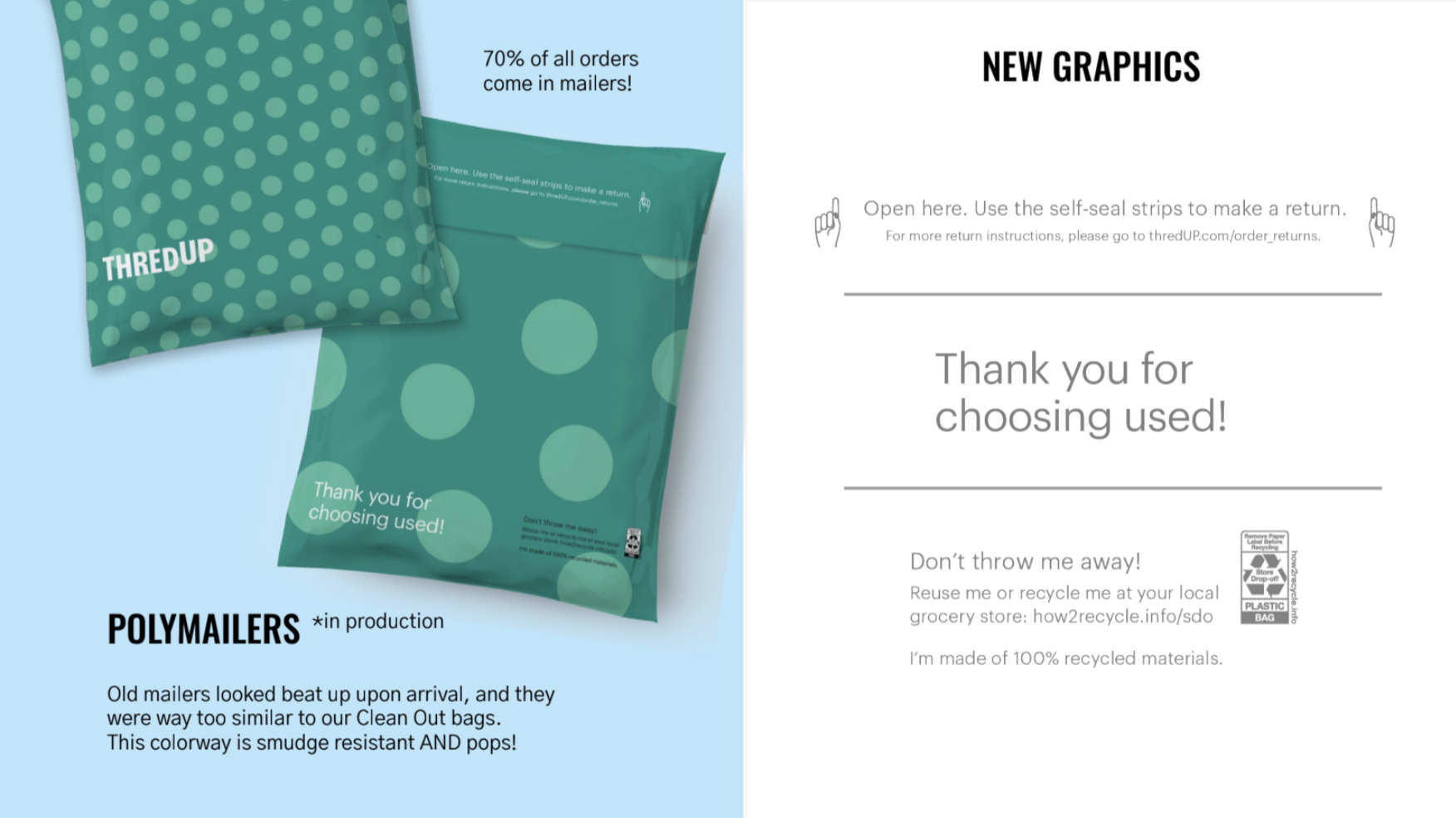 Packaging was the perfect opportunity to show off our most iconic branding elements: our ThredUp green, our polka-dot pattern, our thrift logo, and our bold taglines and statements. The gif on the bottom left was my very first project at ThredUp in 2015. I created a “Why” book that was included with every first purchase - we updated it in 2017 with new copy and imagery but the sentiment stayed the same.