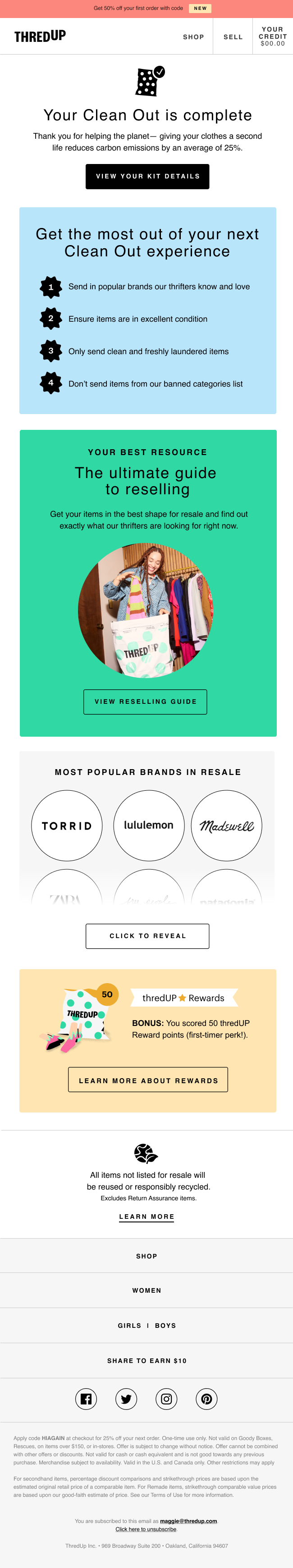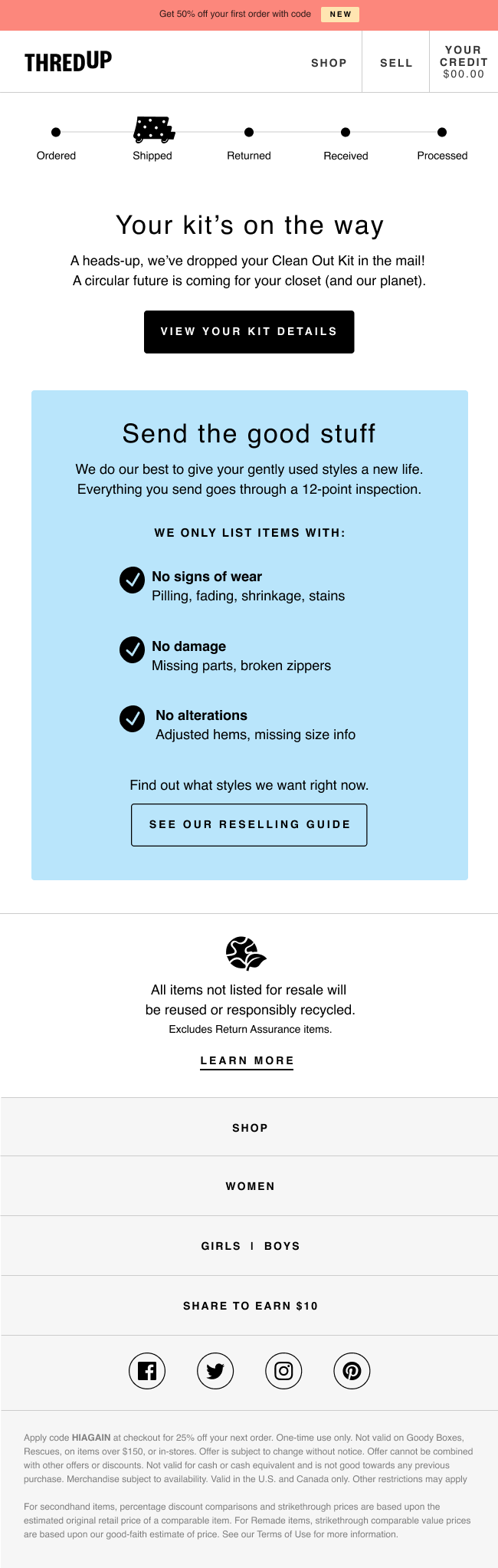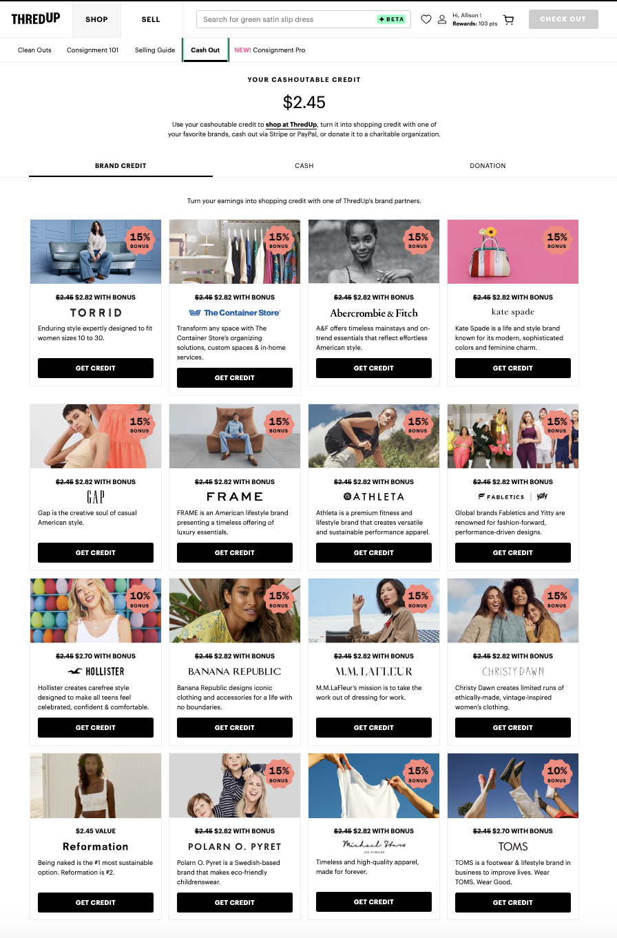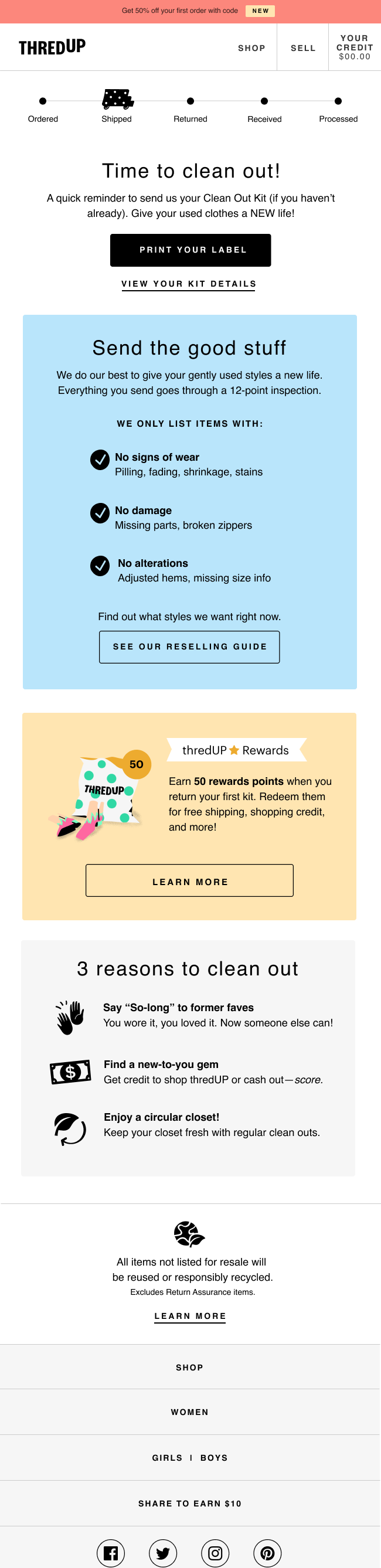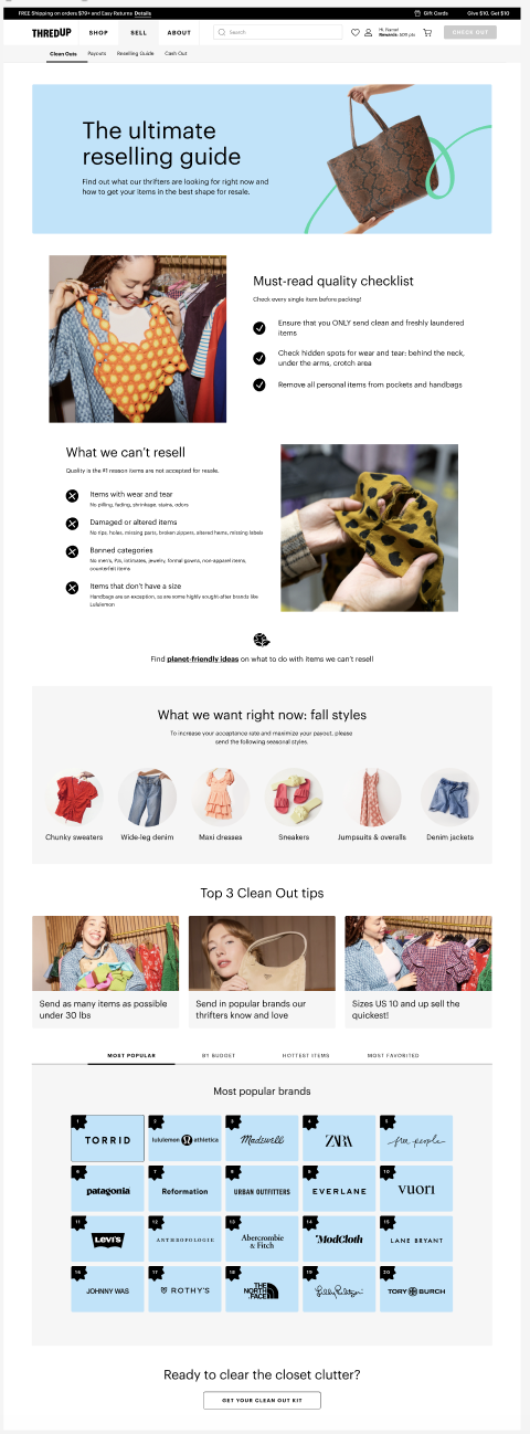 On the supply side, we’re moving away from the concept of “sell” and fully embracing the “Clean Out.” Sell implies a transaction—I give you something, I get something in return. Getting paid out and making money immediately come to mind. Clean Out shifts the focus away from payouts/earnings and towards the convenience of our service and the life-changing magic of editing your closet. It’s also ownable to thredUP and aligns more closely with our overall supply strategy. Sell is also limited to our standard kits, while Clean Out encompasses both standard and donation kits. We’re currently testing this change in the main navigation!
