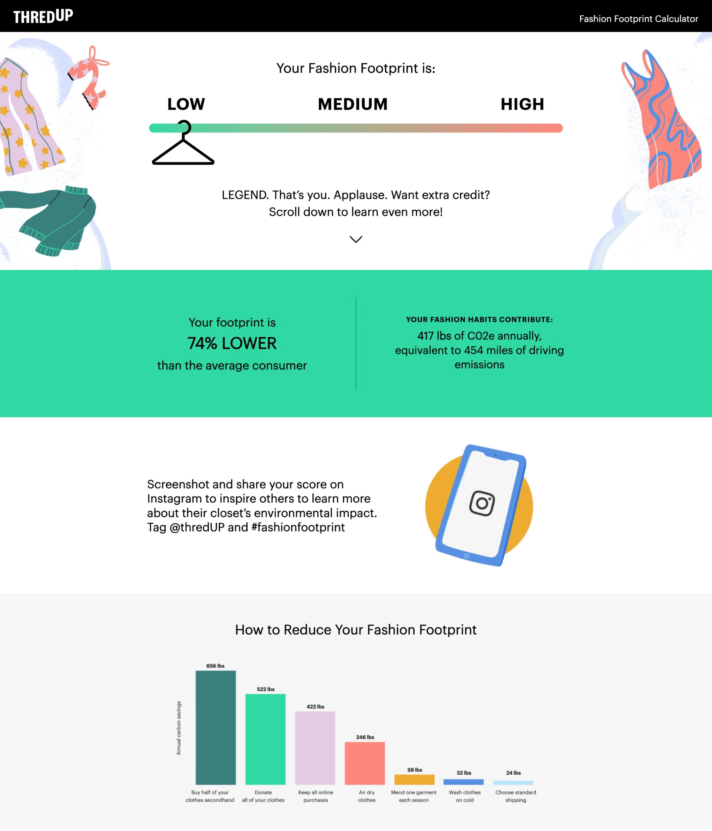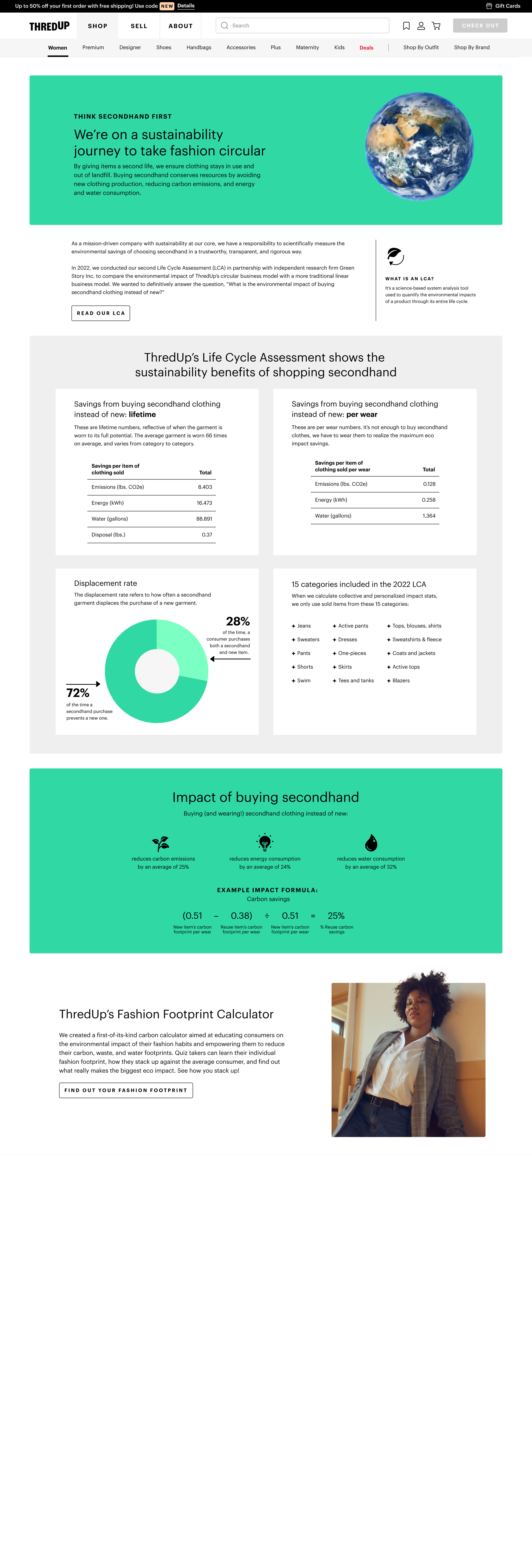 While ThredUp’s business model is inherently sustainable, we wanted to make sure that the messaging felt truly ownable, genuine, and not at all greenwash-y. We took a thoughtful approach and looked at the entire the customer journey, providing context at every touchpoint. We grounded the messaging in facts and provided the why wherever possible, so we could confidently use terms like sustainable, planet-friendly, and eco-conscious. We sought to provide answers to these questions for our community: Why is thrifting sustainable? Why is thrifting better for the planet? What is the actual impact of shopping secondhand?