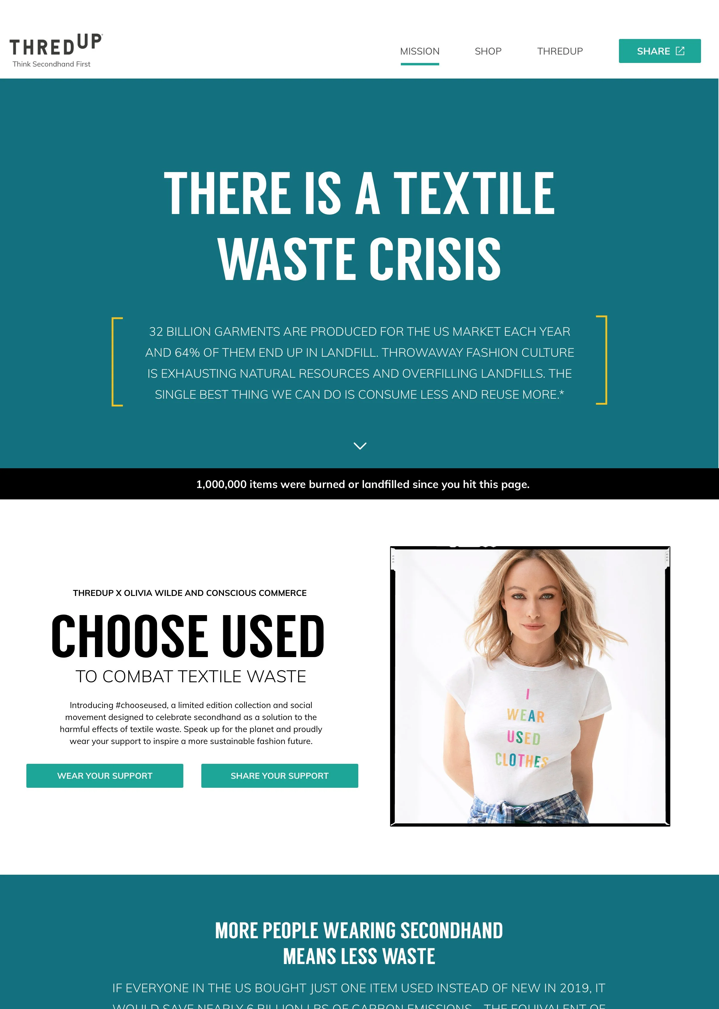 We partnered with Olivia Wilde to launch a 3,000 piece collection of secondhand T-shirts and sweatshirts aimed at destigmatizing used clothing. The Choose Used campaign highlighted the global fashion waste crisis while raising awareness about the positive impact of secondhand. Collection and creative were produced in-house. Exclusive feature and interview in Vogue.